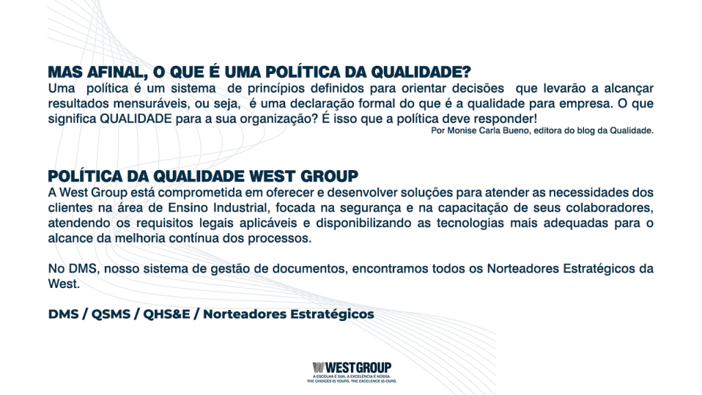 Mas afinal, o que é uma política da Qualidade? Uma política é um sistema de princípios definidos para orientar decisões que levarão a alcançar resultados mensuráveis, ou seja, é…